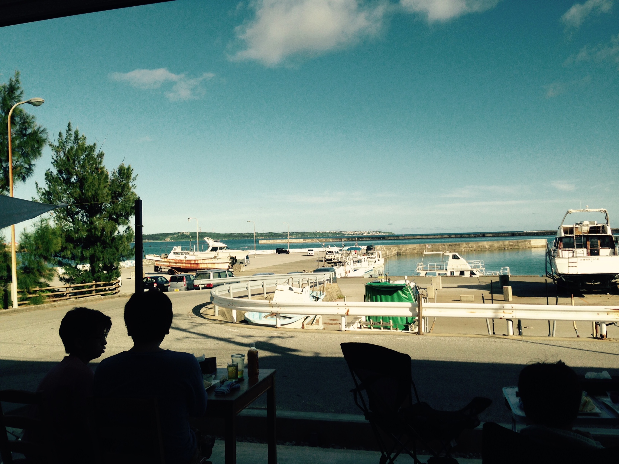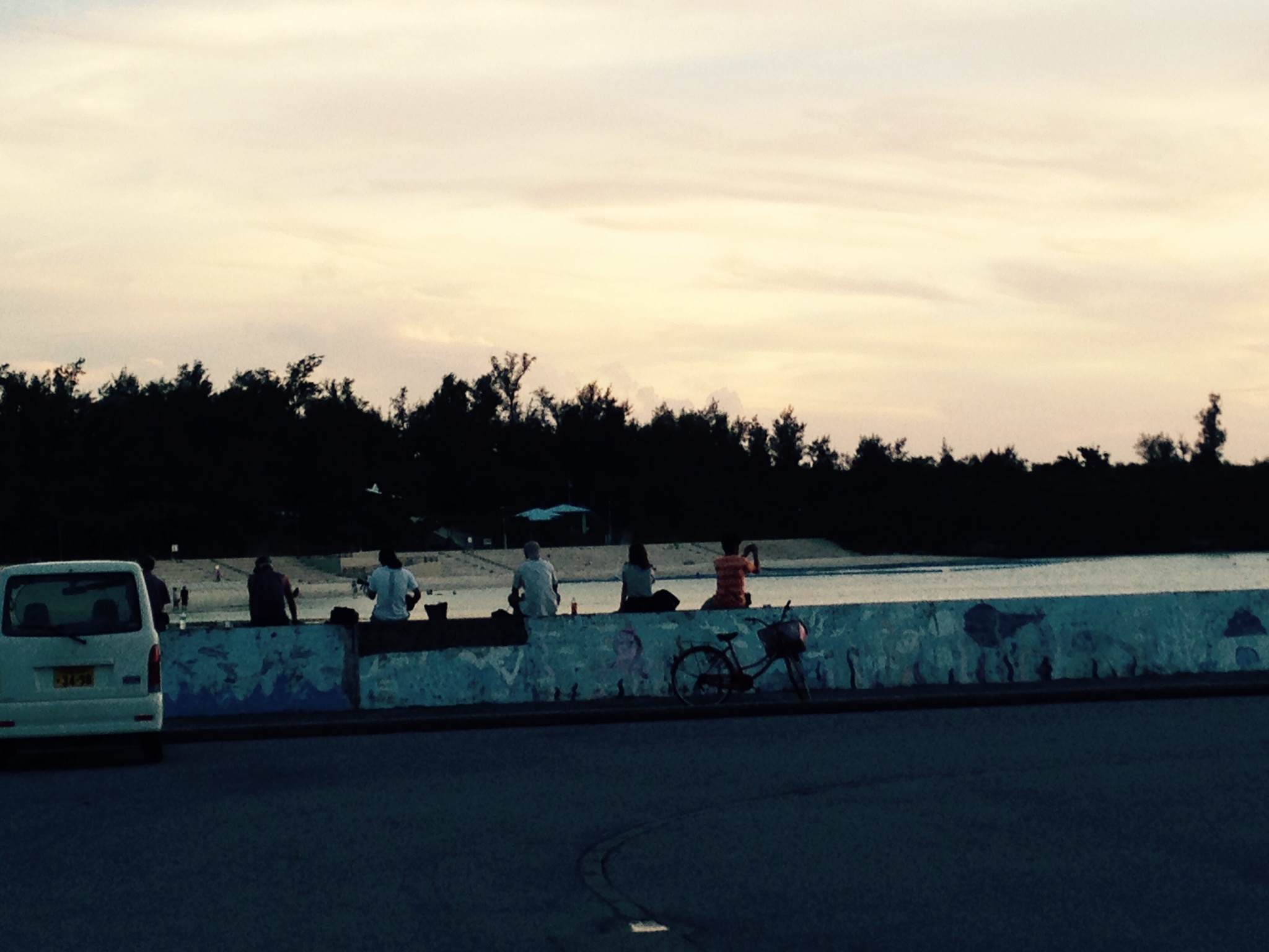 桟橋で釣りをする人々、三線を引く人たちの音色、