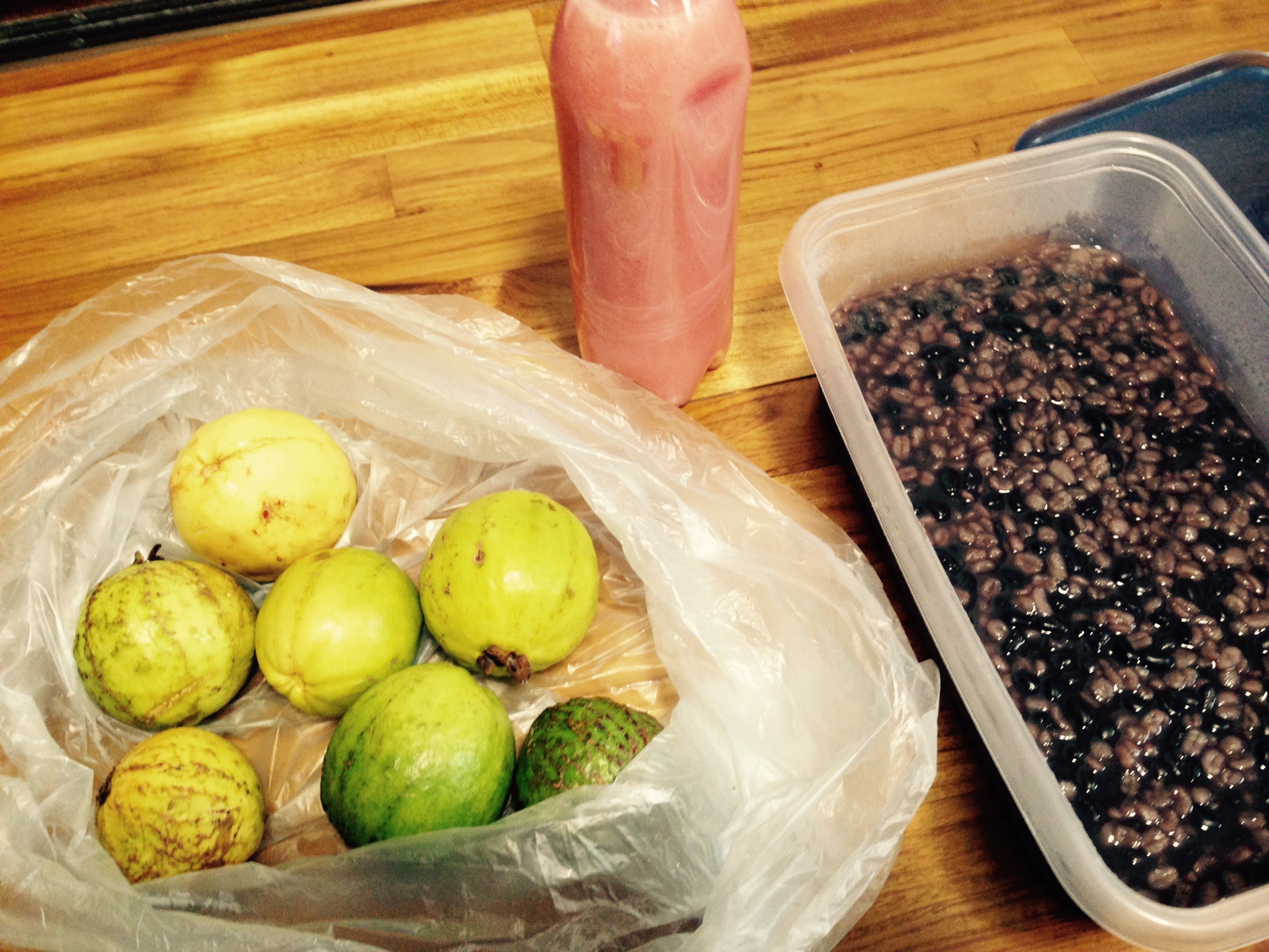 伊良部の豆で作ったぜんざいと、「ばんちきろー」と、そのジュースも頂く。「ばんちきろー」とは、グアバのこと。人によっては「ばんしろー」ともいう。「ばんさぶろー」とは言わない。
