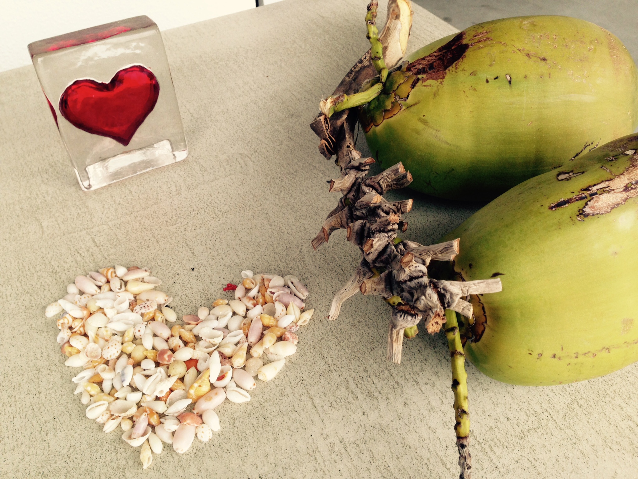 いつも前を通る庭師の人が、ヤシの実を採ってきてくれた。海で拾ってきたという可愛い貝殻も一緒に・・・。