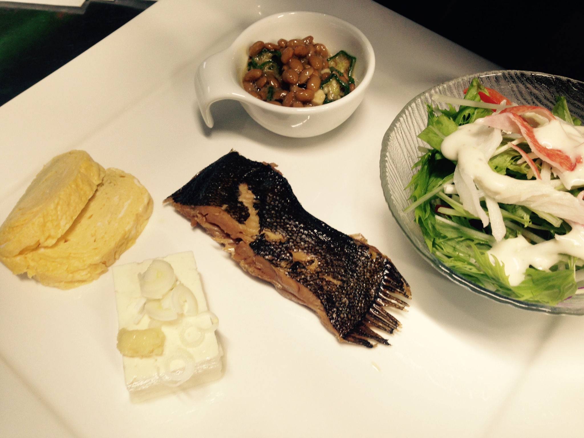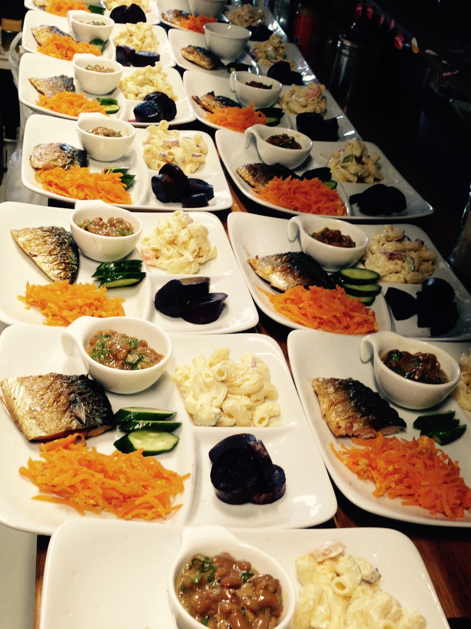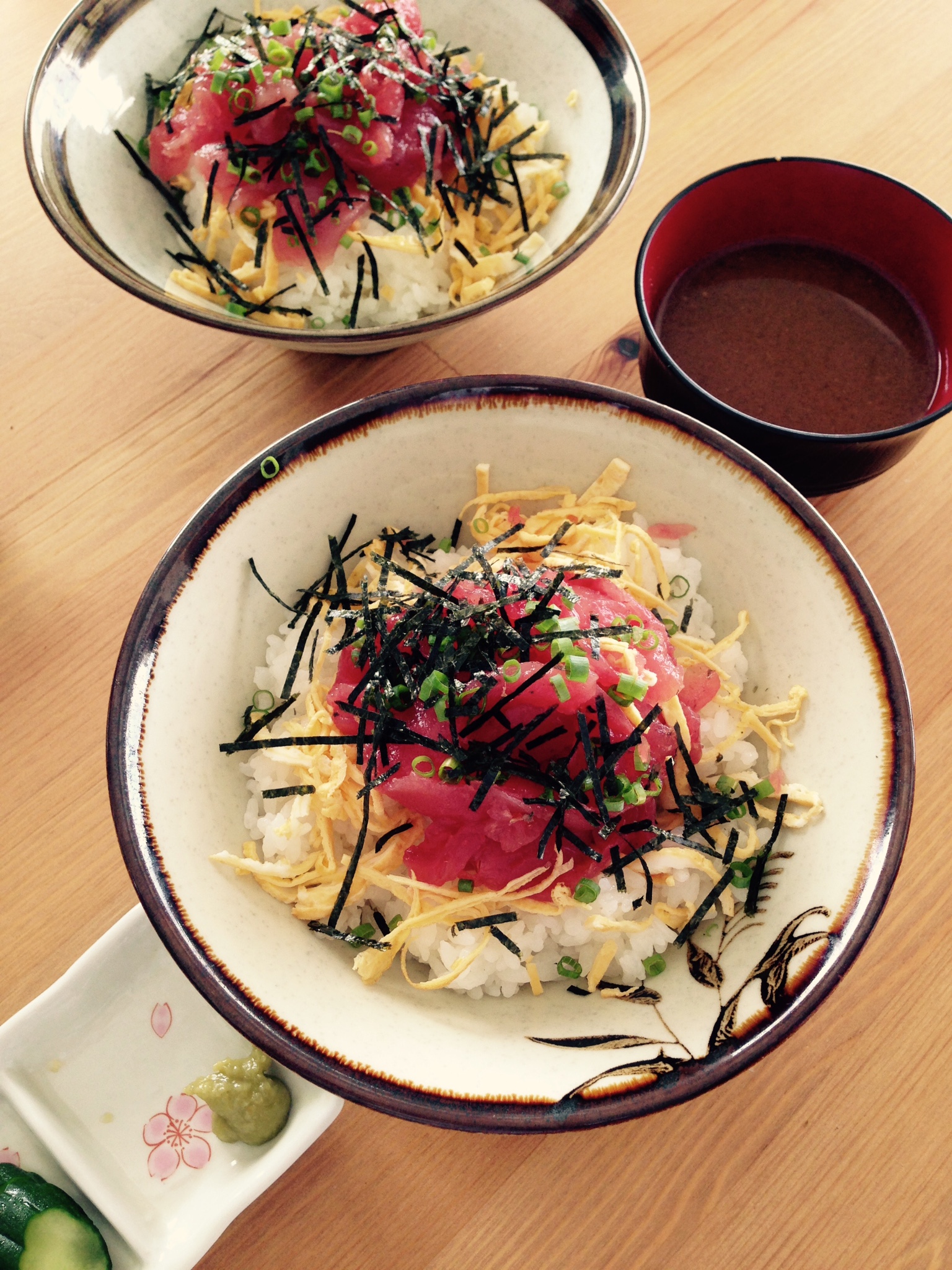 お隣でマグロの解体ショー〈別にショーではないが・・)をやっている時に夫が見学をしていて頂いた中落ちでどんぶりを作った。(恐らく、物欲しそうにしていた)