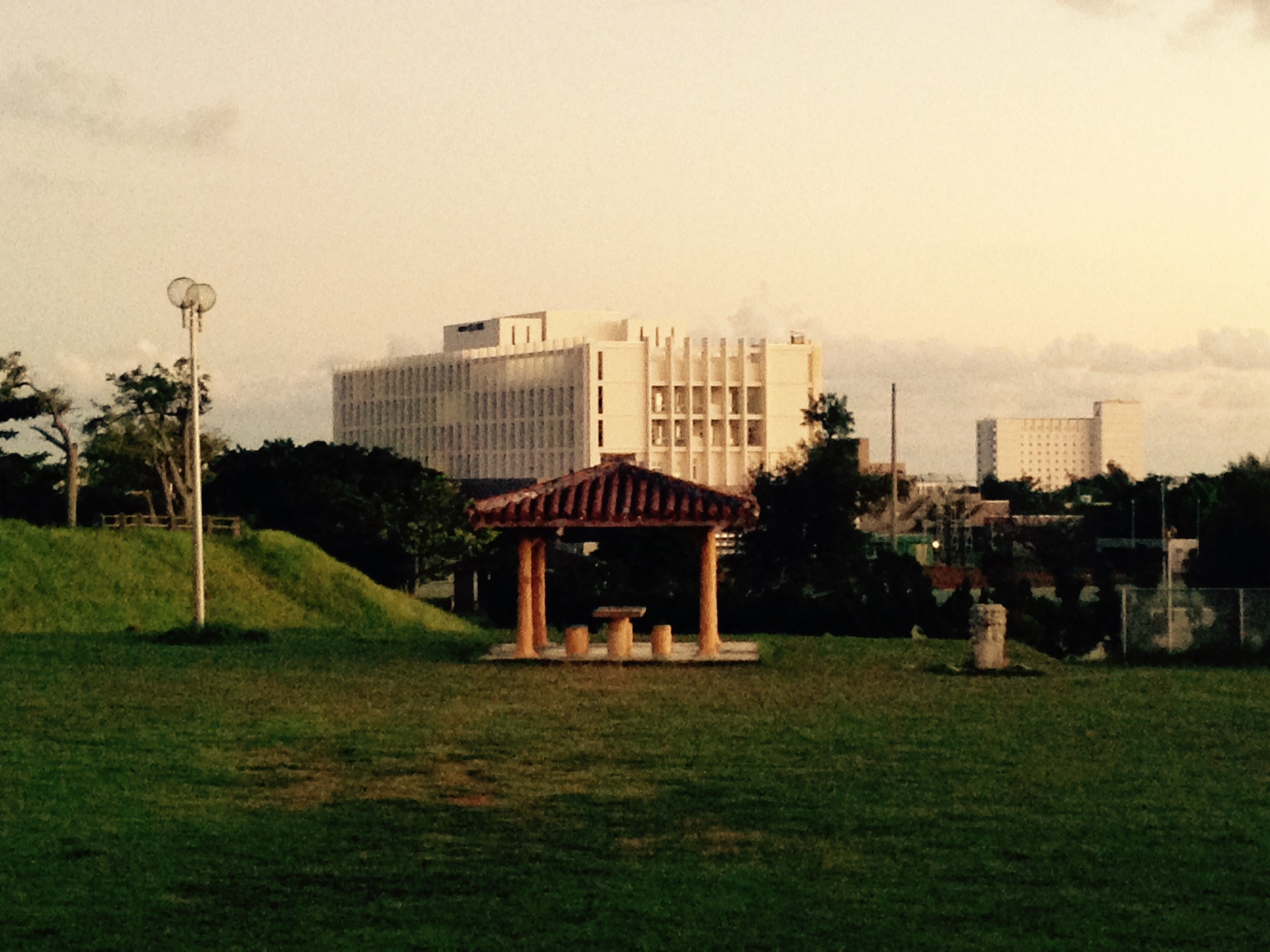 公園のシンボルのシーサーも、朝は面もちが違う。