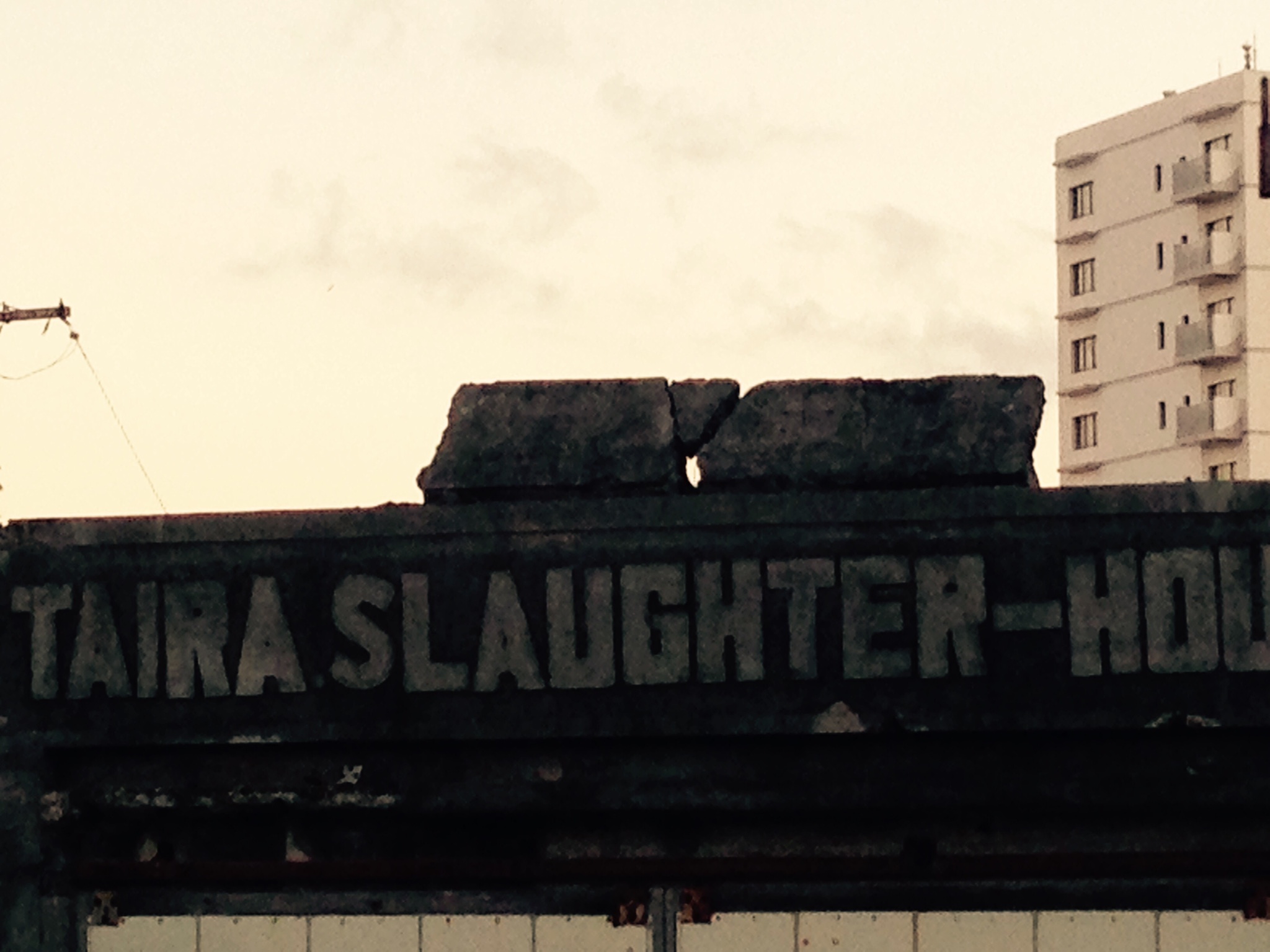 単なる倉庫の様だが、古いコンクリートの建物に彫り込んだ看板がオシャレ。