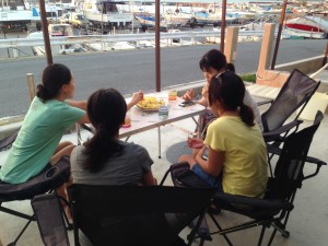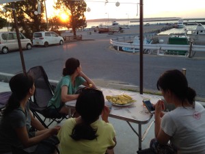パイナップルをテーブルに並べ、夕日を眺めながら「フルーツパーティ」の女の子4人組のゲストさん。オープン当初に一人旅でいらしたゲストさんが今度はお友達と一緒に来てくれました。