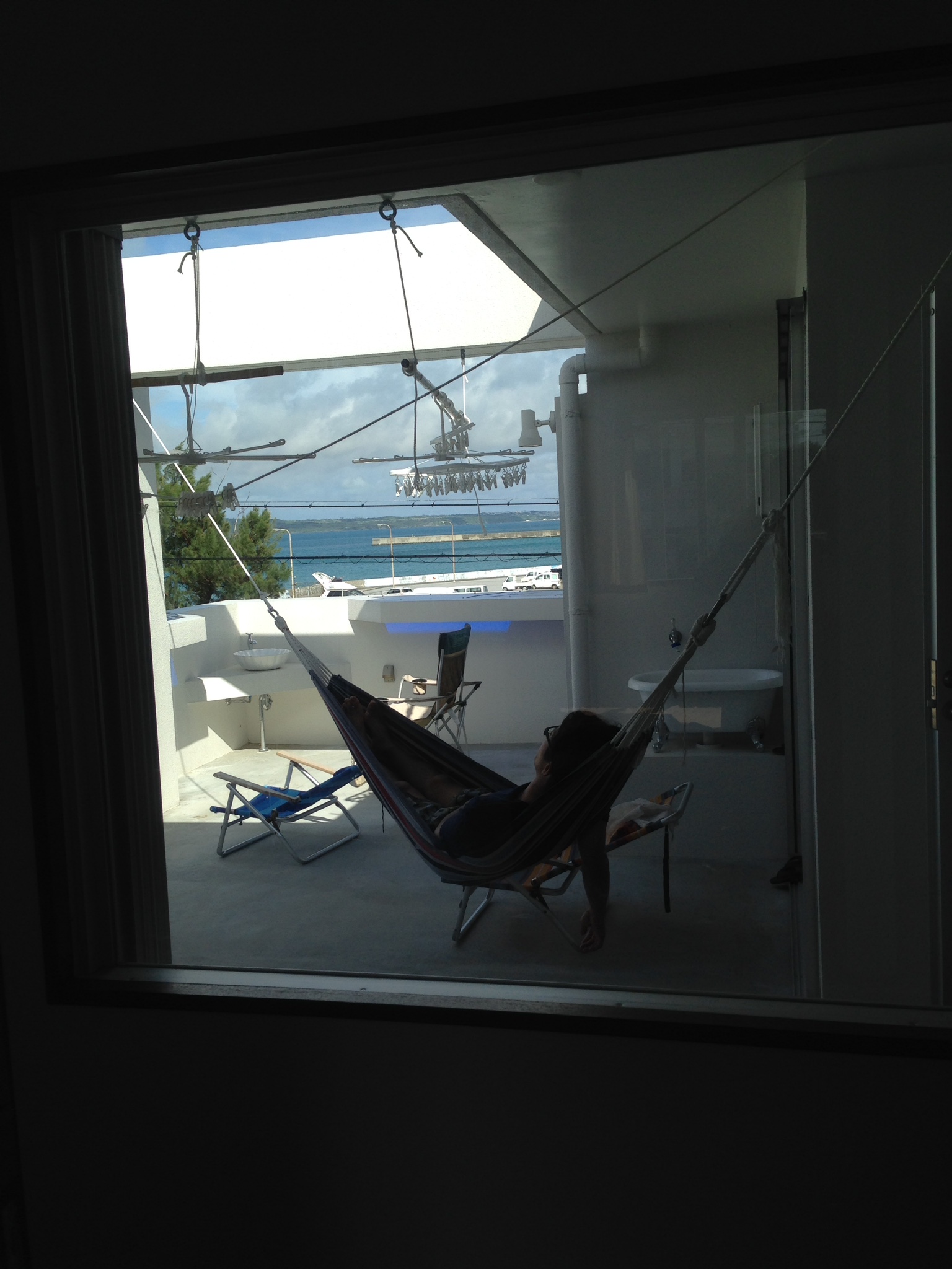 宿のお掃除をしていて、ふと、2階のテラスを覗くと、ハンモックで揺られながら歯磨きをしているゲストさん。いいですね~~。