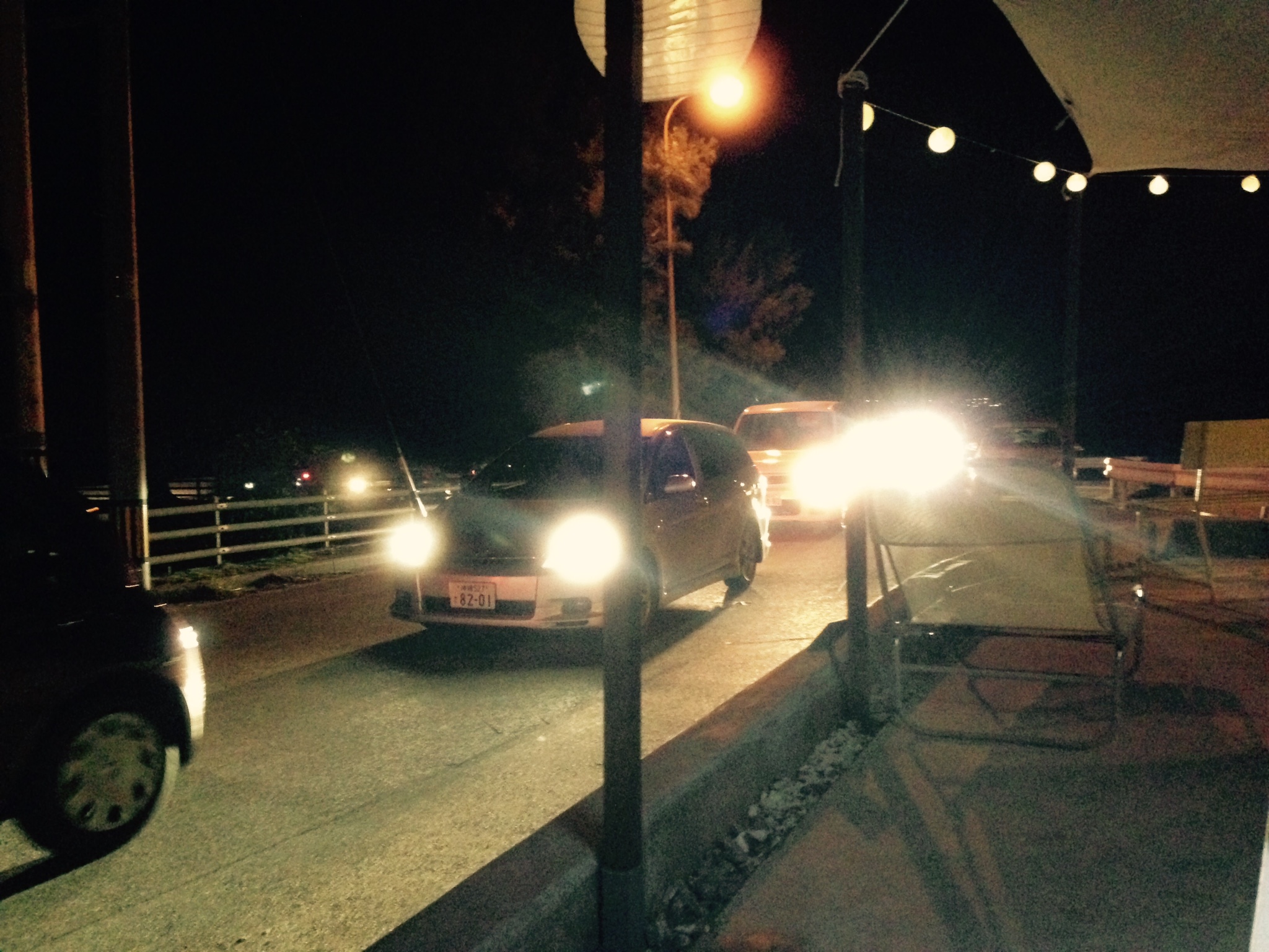 特等席での花火鑑賞。ぞくぞくと集まってくる車。目の前の桟橋はディズニーランドの駐車場の様に車でいっぱいになりました。花火が終った途端、一斉にエンジンをかける音が響き渡り、宿の前の道路は大渋滞!!これもまた、なかなか見ない光景でした。