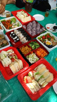 後で送られてきたお昼の風景写真。美味しそうなお弁当が並んでいた。しまった~~~!!素知らぬ顔して座っていればよかった~~!!