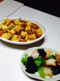 島豆腐を使った「しま~ぼ~」(麻婆豆腐)と、エビとホタテのブロッコリー炒め。
