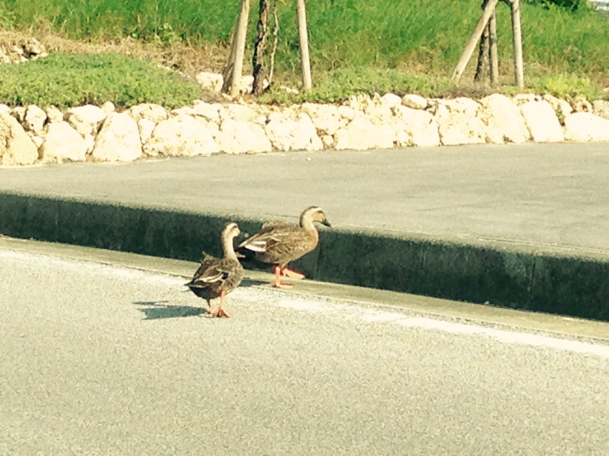 カモの親子が横断中。