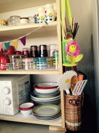 静佳キッチンのカトラリーのまとめ役に就任。出番を待っていた籠のケースと共に手作りの棚に吊るされた。