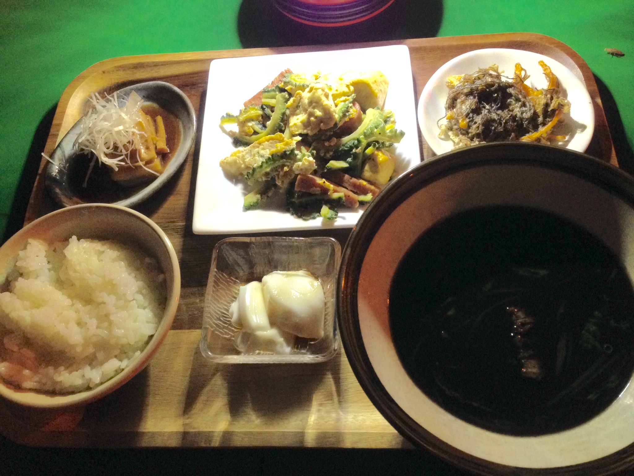 ゴーヤチャンプルーに、ラフティー、宮古のモズクの天ぷら、イカスミ汁にジーマミー豆腐。