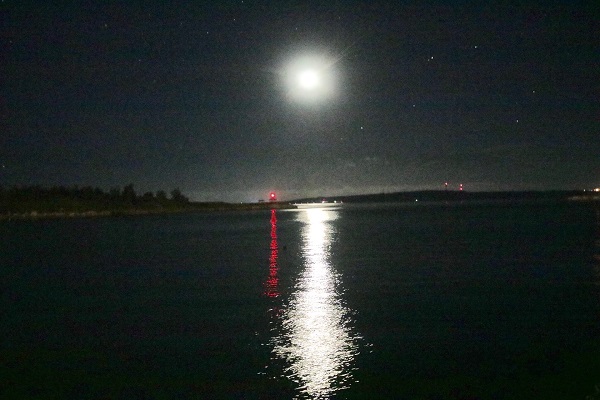 酔いが回ってくる頃に、何気なく月がいた方角に目がいった。すると、なんと沈みかけているではないか。さっきまでの白い月は、夕日のように黄金色に輝き、海に同色の絨毯を延ばしている。