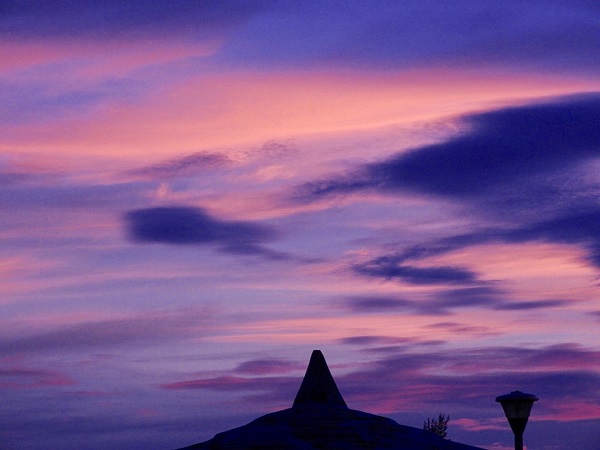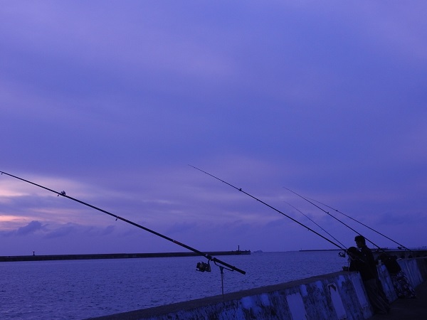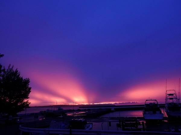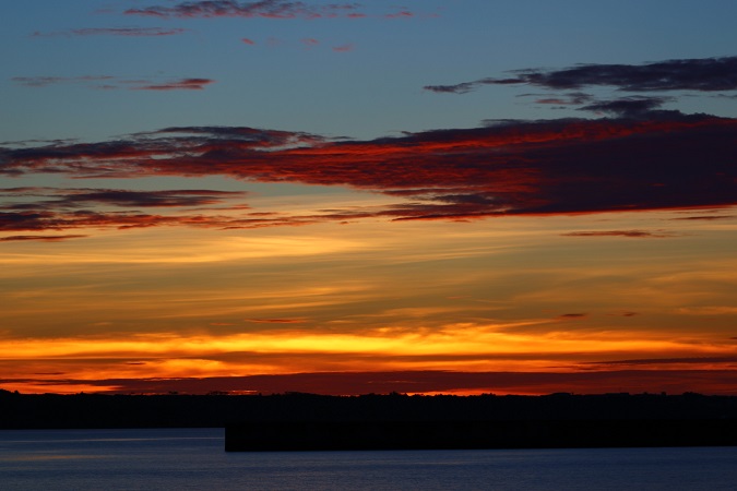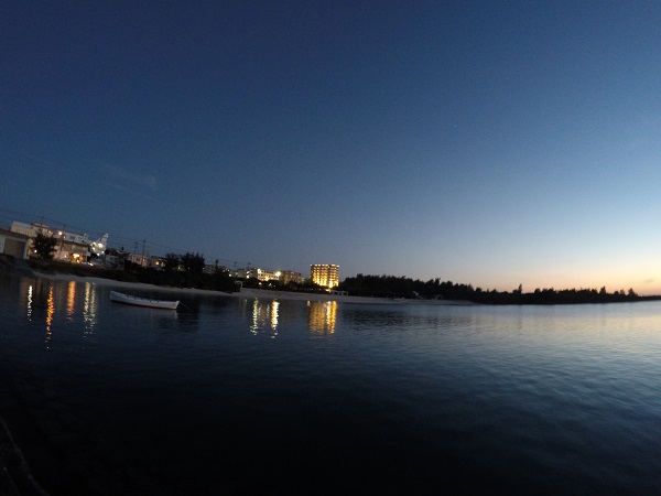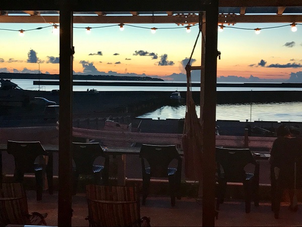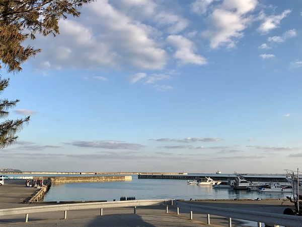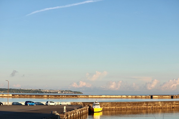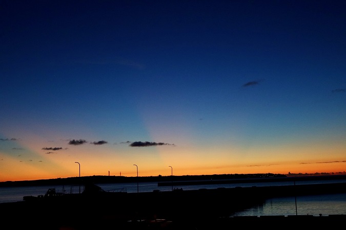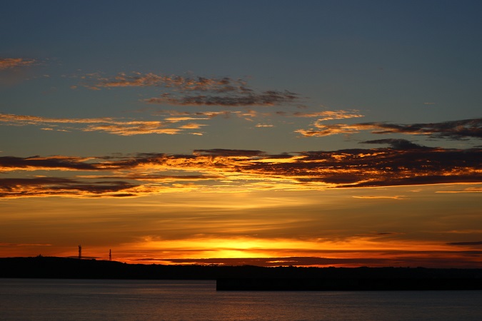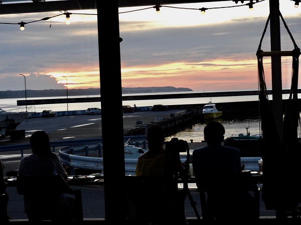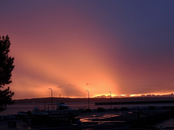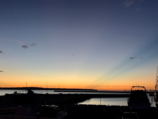 港のそばまで戻ってくると、ちょうど沈み始めた夕日が我が家の方向を示していた。