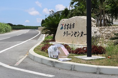 島中のごみを集めるクリーンセンターに向かった際、入り口の看板の前に捨てられているごみを発見。この看板を集積所と勘違いしたのか、ここまで来て力が尽きたのか面倒になったのか・・・。こういったとぼけた光景を見るにつけ、まだまだ私は大丈夫!!と、自信をつけるのであった。