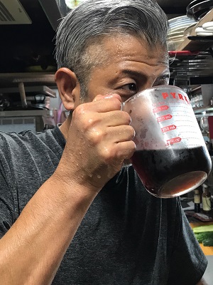 たくさん歩いた後はワイルドに水分をとる夫。どこまでも几帳面な彼は、メジャーカップが手放せない。