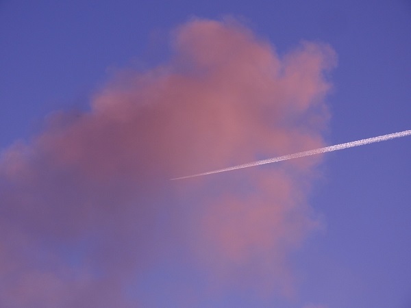 夕日を受けてピンクに染まった大きな雲に向かって飛ぶ飛行機。