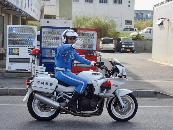 白バイのお巡りさんは、決してこっちに手を振っているわけではない。