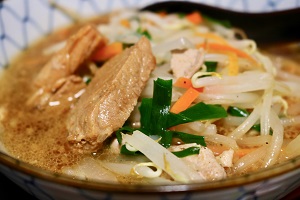 我が家のお昼はもやし味噌ラーメン。宮古そば用に作った肉をのせて・・・・。
