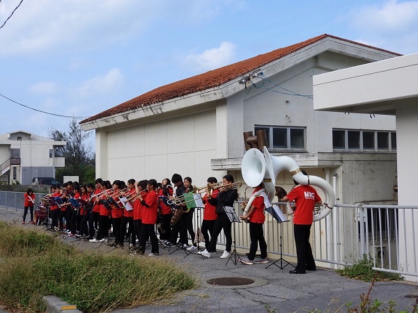 ビックリして道路まで歩いて行くと、高校生のブラスバンドが演奏を始めていた。これは初めて見る光景。