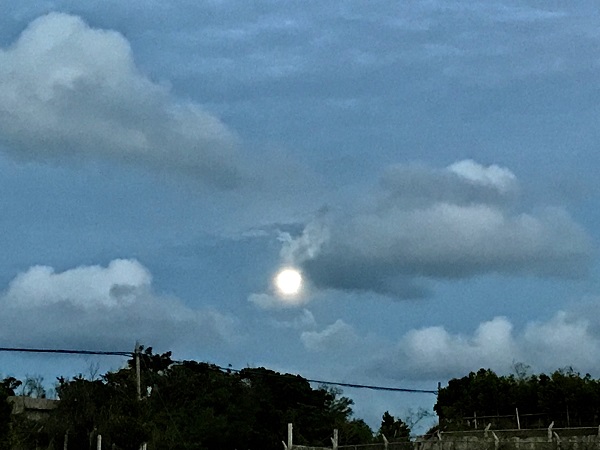 その日の夕方、忘れたものを買い足しに一人車を走らせると、まだ明るい空にまん丸のお月さま。