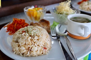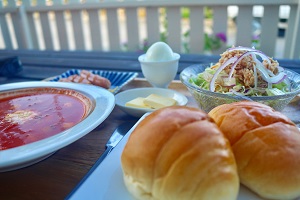 ポークランチョンミートの「海を眺めるレストラン HELL’S KITCHEN(ヘルズキッチン)」では、宿泊の方限定で朝食と夕食を準備しております。完全お任せメニューの完全予約制です。