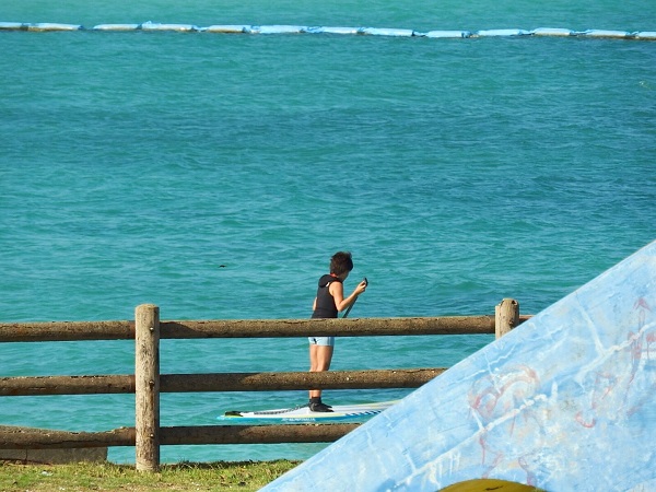 それぞれに仲良くなった人を見つけ、最終日も別の宿泊者と大神島へ・・・・。でも、SUPはお隣のパイナガマビーチで二人仲良く。