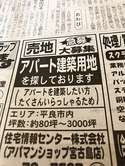 新聞で見つけた広告。宮古では今建築ラッシュなので建築用地を急募のようです。