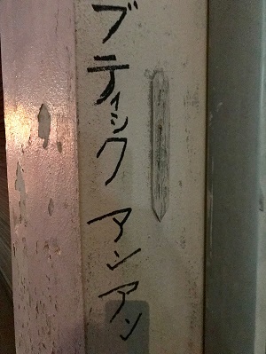 ブティックの看板がコンクリートの柱に直書きされているのを見て笑い、