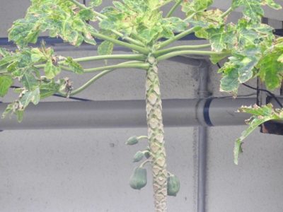 パパイヤが生っていると、別の意味でついつい目がいってしまう。目はいっても手を出してはいけない。