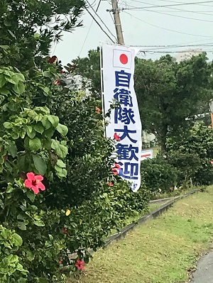 帰り道に見つけたのぼり旗。「〇〇に反対!!」というのぼり旗はよくあるけれど、「自衛隊大歓迎」って・・・・。