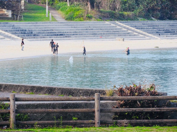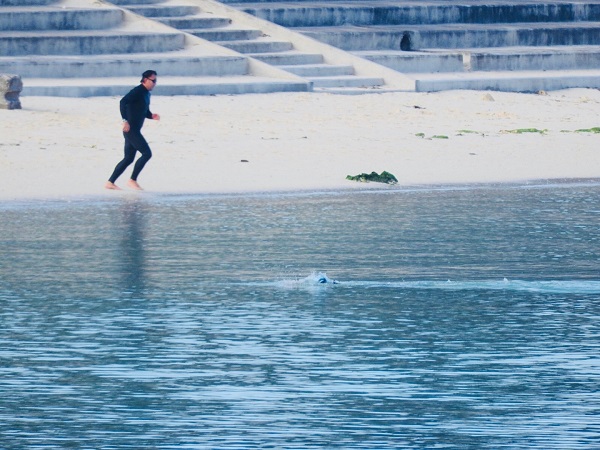 お客様に遅れて私達もテラスで朝食を頂いていると、目の前のパイナガマビーチでは泳いでいる人達。