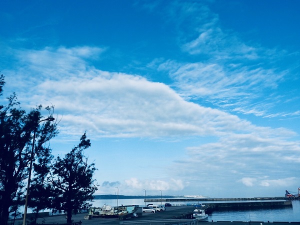 朝食時には水色の空に大きな雲。清々しい朝でした。