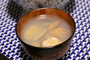 顔が付いていてちょっとキモい。大粒のアサリ汁と共に。