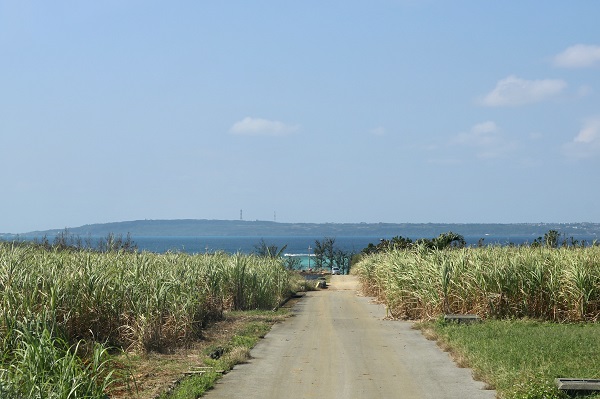 農道の先に垣間見える宮古のブルーは、それだけで心をパーティ気分にまで盛り上げる。