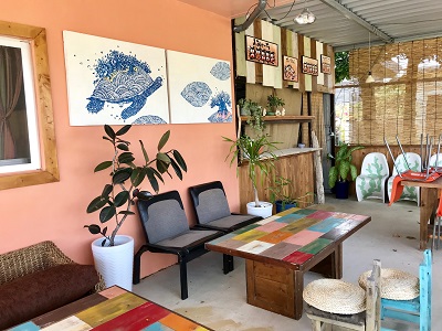 道路に面したテラス席はとてもかわいい手作り感満載のつくりだった。オーナーは絵を描く人だと義姉が言っていた。
