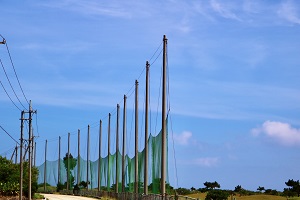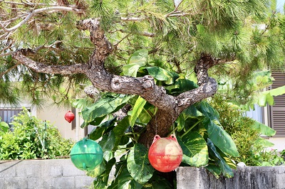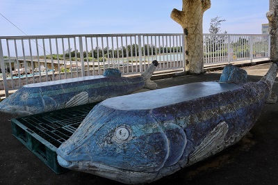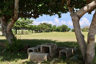 コンクリート魚があったのは、広い公園の中。公園なのにサバ二が置いてあるのは島ならではの光景。