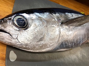 ドキッ!!朝から何を?(お酒を想像するのは私だけ・・・)と思って振り向くと、ニンマリと笑ったおじさんの手にはマグロちゃんが一匹ぶら下がっていました。私はやっちゃえないので、夫にさばいてもらいます。