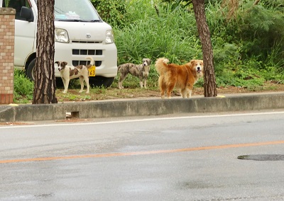 例の4犬衆に出くわした。久し振りだな。どこまでも進出するこの4匹組。みんな種類が違うがとっても仲良し。どこへ行くのも一緒。