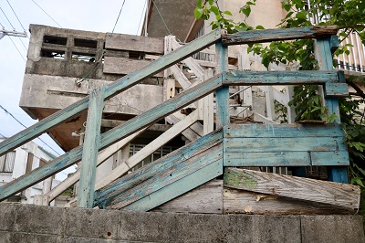 そうかと思えば初めから手すりがない、おっかない階段。どこから登ってどこへ行くのか・・・。