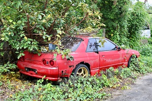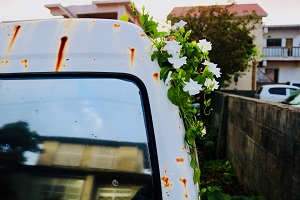 こちらも捨てられた車なのか・・・花嫁のように頭に花飾り。放置時間の長さを物語っている。