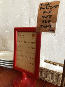 メニューはカレーのみ。日替わりでトッピングが3種類とは、よく考えたなと思いました。飽きないですもんね。