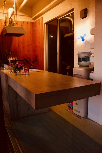 キッチンに並ぶボトルも昼間とは違う表情になっている。