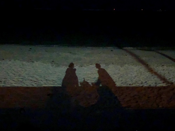 我が家の方向から歩いてきたカップルのシルエットが、公園の街灯から伸びてくる光の筋と重なった時、ちょうど止まった。