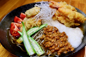 夜の納豆にハマっている私は、夫に頼んでネバネバ蕎麦も作ってもらいました。