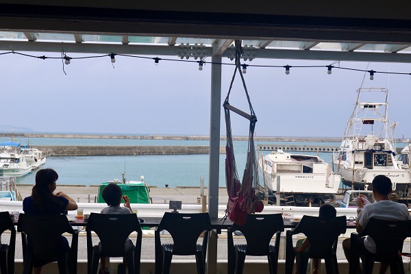 海と空を眺めながらテラスのカウンターでどうぞ。
