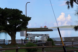 大きなクレーン車までもわざわざ遠回りしに来ます。この人もまた桟橋をぐるりと回って海を見てから道路へ戻りました。