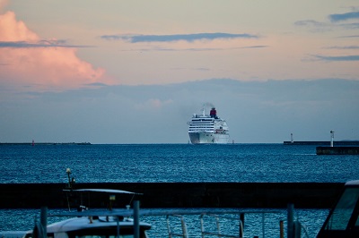 テラスに出てみると、パノラマに広がる海の向こうから大きな船が入ってくるところも見られます。