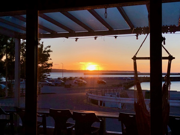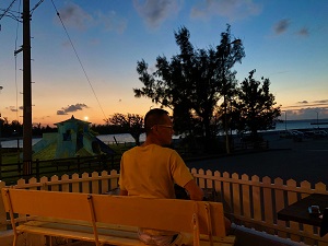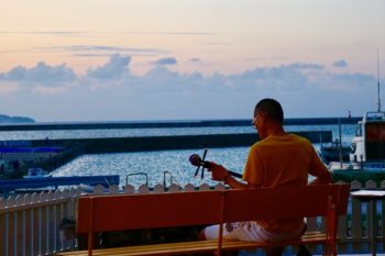 独学で1年間勉強した三線を、夕日を眺めながら弾くのが夢だったというA氏。その夢は少し叶ったようです。ポークランチョンミートのテラスにて初日に・・・・。