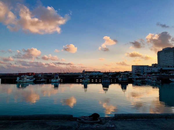 先日の朝、桟橋まで出てみると、可愛い雲達が空と海で音符の様に踊っていました。