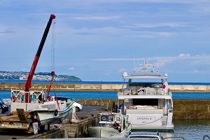 いつも船を降ろす場所には見知らぬ船が停泊中。どうするのかな?