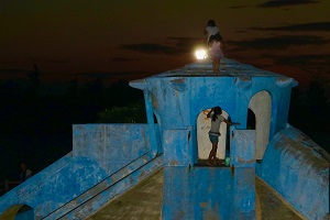 暗い中、宿の隣の公園の滑り台で爆遊びする子供達。これには内地からのお客様もビックリ仰天!!島はどれほど安全なのか・・・・・??女の子だって裸足でてっぺんまで登っちゃいます。